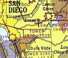 Sweetwater Dam Naval Outlying Landing Field was a airfield near Naval Auxiliary Air Station Brown Field and Naval Air Station North Island used to support the training of US Navy pilots during World War 2. The runway built in 1944 was located in what is now a neighborhood 8 mile east of San Diego, California. The Navy support airfields are called Naval Outlying Landing Field (NOLF). For the war, many new trained pilots were needed. The Naval Outlying Landing Field provided a place for pilots to practice landing and take off without other air traffic. Sweetwater Dam site offered flight training without distractions. Most of the new pilots departed to the Pacific War after training. The Sweetwater Dam Outlying Landing Field had no support facilities. After the war the Outlying field closed in 1946, having completed the role of training new pilots. Sweetwater Dam Naval Outlying Landing Field and Sweetwater Carrier Landing Strip. The Landing Field had a single 3,000-foot east/west asphalt runway. The Navy leased 135.45 acres of grassland from Rancho de la Nación for the Landing Field. In 1949 the runway became a private civil airport, the Sweetwater Dam Airport also called the Paradise Mesa Airstrip. The Airport is named after the nearby Sweetwater Dam that makes the Sweetwater Reservoir. The Airport closed in 1951 and the runway became home to the Paradise Mesa Drag strip. The Carlsbad, California's Oilers Club help start the drag strip with the first meet on March 11, 1951. At its peak, 25 clubs were using the strip. The drag strip closed in 1959. Houses were built on the site, now called Paradise Hills and no trace of the runway can be found today. Part of the site is also the Daniel Boone Elementary School.[1][2][3]
