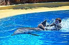 Swimming with dolphins has resulted in stress, injury, and death for dolphins.[1] Dolphins are often susceptible to similar respiratory ailments as humans, and swimming in confined spaces can add to mental distress and weaken their immune systems.[4] Behavioral and wildlife biologist Toni Frohoff has stated that even if dolphins appear to be enjoying their interaction with humans, they may be "performing" out of fear of isolation and punishment.[4]