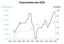 The SCB based in Basel was founded on 4 February 1853 by Johann Jakob Speiser, Achilles Bischoff and Karl Geigy. The shares were mainly owned by Parisian banks. But Basel banks and the cantons of Basel-Stadt and Basel-Landschaft were also involved. The issue of shares worth Swiss Francs (CHF) 36 million and bonds worth CHF 12 million were planned. Speculation on the Paris stock exchange, however, led to a sharp fall in prices. Thus, the value of the SCB shares fell from CHF 500 to 200 and the share capital finally amounted to only CHF 14.5 million. The cantons of Luzern and Bern and Bernese municipalities rescued the company by buying shares and subsidies totaling CHF 6 million.