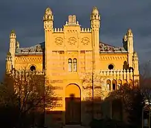 The synagogue has a three-partite front in the Moorish style and is decorated with horizontal red-yellow stripes, octagonal stars and slim minaretes. The door and windows are built in the Rundbogenstil. On top of the central part between two of the minarets are the Tablets of Law.