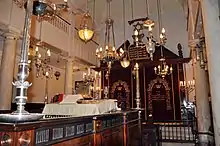 The entrance to the original building was on Synagogue Lane, now Serfaty's Passage. Following its destruction in the storm of 30 December 1766, a larger synagogue was rebuilt at the same site in 1768, but with an entrance on Engineer Lane. The second building was also destroyed during attacks by the Spanish on 17 May 1781. A third building was constructed after the conclusion of the Great Siege of Gibraltar. In 1812, that version of the synagogue was damaged by fire and had to be partially rebuilt. The current vaulted ceiling of the synagogue dates from that 1812 renovation.[3][4] The synagogue at 47/49 Engineer Lane has colourful tiles, marble floors, wrought iron spindles, and wooden furniture.[2] The Great Synagogue not only remains active; it is still Gibraltar's principal synagogue.[4][12]