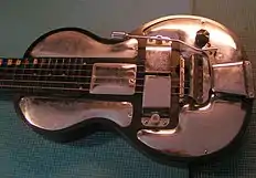Some early Vibrolas on Rickenbacker guitars were not operated by hand, but rather moved with an electrical mechanism developed by Doc Kauffman to simulate the pitch manipulation available with steel guitars. The Vibrola distributed as an option with Rickenbacker Electro Spanish guitars was hand operated like the earliest Epiphone Vibrolas.[12] A later unit was created and used on Rickenbacker's Capri line of guitars in the 1950s, such as John Lennon's 1958 Rickenbacker 325. It was a side-to-side action vibrato unit (rather than the up-down action of later units) that was notorious for throwing the guitar out of tune, hence Lennon's replacing his with a Bigsby B5 unit[13] (Lennon's 1964 Rickenbacker 325 came fitted with a Rickenbacker Ac'cent vibrato unit).[14]