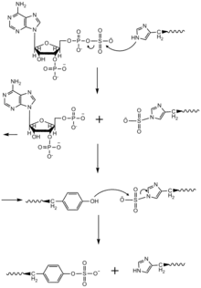 A two-site ping-pong mechanism for TPST and the tyrosine sulfating has been proposed. PAPS enters one site of TPST and the sulfonate group is transferred to a Histidine residue in the enzyme and PAP is released. Then, the target protein and tyrosine bind TPST and the histidine transfers the sulfonate group to the target tyrosine.[11]