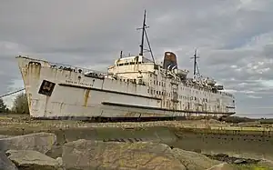 TSS Duke of Lancaster is a former railway steamer passenger ship that operated in Europe from 1956 to 1979, and is beached near Mostyn Docks, on the River Dee, in north Wales. She replaced an earlier 3,600-ton ship of the same name operated by the London Midland and Scottish Railway company between Heysham and Belfast.