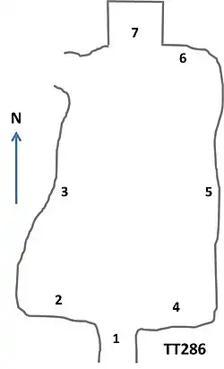 TT286 belongs to Niay the ‘scribe of the table,' and dates to the 20th Dynasty.[1][2][3] TT286 is a "multi-chambered tomb with rich surviving wall decorations."[1]