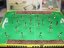 Tabletop football is a class of tabletop game simulating mainly association football, but also either of the codes of rugby, or some other form of football such as American football or Australian rules football. The games employ miniature figures of players on a bounded playing board or table that looks like a football pitch (field).