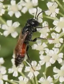 Tachysphex pompiliformis is a species of square-headed wasp in the family Crabronidae. The limits of the species were redefined in 2016, when it was recognized that the name pompiliformis had been misapplied to at least 14 very similar species, some of which had already been named, and others which had not; of 16 former synonyms of pompiliformis, four were restored to species status (Tachysphex austriacus, Tachysphex dimidiatus, Tachysphex jokischianus, and Tachysphex nigripennis), and the status of the remainder is uncertain.[1] As such, the distribution of this taxon is somewhat uncertain, pending a rigorous review of existing specimens, though it has been definitively confirmed as occurring in Austria, Bulgaria, Czech Republic, France, Germany, Greece, Hungary, Italy, Kyrgyzstan, Portugal, Slovakia, Switzerland, and Turkey, while pompiliformis specimens reported from other locations most likely represent other species.[1]