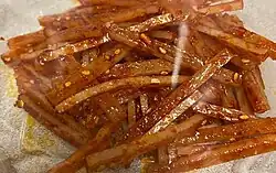 Taegu (Korean: 대구) is the Korean term for codfish.[1] While commercial taegu is commonly made with dried cod, most home recipes still use dried shredded cuttlefish as it is more widely familiar and available. Taegu is quite similar to the original Korean ojingeo-chae-bokkeum recipe in terms of ingredients. However, Hawaii recipes generally do not "bokkeum," or stir-fry, the seafood nor cook the seasonings. Rather all the ingredients are combined and left to marinate.[2][3][4]