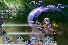 At certain locations in the game, characters can engage in cooking various recipes: cooking them between battles restores health points. If the recipe is cooked enough times, a character masters it. Upon mastery, a character is granted experience points each time the meal is prepared.[4] Characters are also given "rations", helpings of restorative food, at selected locations across the game world. While initial rations are fairly small, a special "meal ticket" is made available later in the game, which provides larger rations.[5] There are multiple difficulty levels.[4] Mini-games are also available to play, with three types in the game. The first has the character Veigue on a raft navigating a river, with the goal being to avoid dangerous obstacles. The second is a tarot game with the character Hilda, where the player answers questions given by Hilda and has their fortune told. In the third, the player becomes a waiter at an inn, with the goal being to provide good service to the customers: poor service results in the player being dismissed, while good service earns a reward.[6]