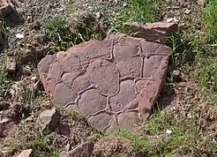A sandstone slab from the lower beds of Bromacker, showing cracked mudstone drapings.