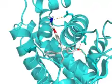 Crystallographic structure of afimoxifene (carbon = white, oxygen = red, nitrogen = blue) complexed with ligand binding domain of estrogen receptor alpha (ERα) (cyan ribbon).[61]