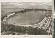 The race track, then named Tanfaran Park, opened for racing on November 4, 1899.[14] The 1 mi (1.6 km) oval track was oriented with its major axis lying along an imaginary line between the Golden Gate and Mount Hamilton.[15] The grandstand had seats for 3000 with a total capacity for 5000 spectators; service was provided by Southern Pacific on the Peninsula Commute via a stop in front of the grandstand, just 30 minutes from the Third and Townsend Depot.[15] Before races started, the neighboring Bay Area tracks agreed to have half the regular season raced at the California Jockey Club in Oakland (that racetrack opened as the Oakland Trotting Park in 1871[16] at the Emeryville Shellmound in what is now Emeryville),[17][18] and to split the remaining half between Ingleside in San Francisco and the new Tanfaran Park track in San Bruno.[19] The track's name quickly was corrupted to Tanforan Park within that first winter season, which lasted just two weeks, holding six races per weekday, from 1:30 PM to 4 PM.[20] In addition, six stakes races were scheduled to be run.[21]