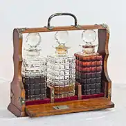 A Tantalus is a small wooden cabinet containing two or three decanters. Its defining feature is that it has a lock and key. The aim of that is to stop unauthorised people from drinking the contents (in particular, "servants and younger sons getting at the whisky"),[1] while still allowing them to be on show. The name is a reference to the unsatisfied temptations of the Greek mythological character Tantalus.
