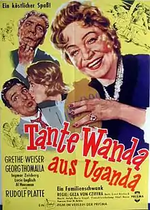 Tante Wanda aus Uganda ("Aunt Wanda from Uganda") is a 1957 West German comedy film directed by Géza von Cziffra and starring Grethe Weiser, Georg Thomalla and Lucie Englisch.[1] The screenplay concerns a strong-willed woman who returns from Uganda and puts the lives of her family in order.