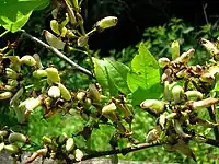 Pocket plum galls on bird cherry at Dalgarven Mill in Ayrshire, Scotland