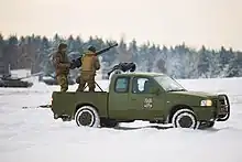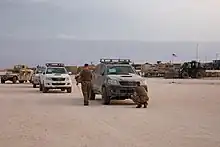 Technicals were used by Iraqi military forces in the 2003 invasion of Iraq.[29] The Iraqi Republican Guard and Fedayeen emulated tactics of the Somali National Alliance with limited success,[30][31] but were outmatched by Coalition armor and aviation.[32][33] In the aftermath of the invasion technicals saw use by Iraqi insurgents for transporting personnel and quick raids against the Iraqi police forces. The insurgent use of technicals increased after the Iraq Spring Fighting of 2004.