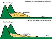 Alluvial fan development is highly influenced by Tectonic uplift based on the rate of uplift through fan development. As shown in the figure, if tectonic uplift during deposition is greater than the flow of the stream depositing the sediment, then the alluvial fan's deposition will form closer to the mountain range in a more concentrated state. However, if the rate of tectonic uplift is not as significant as the flow of the stream depositing the sediment, this results in a more spread out, flatter alluvial fan which has a greater distance from the mountain range it is formed from.[2]