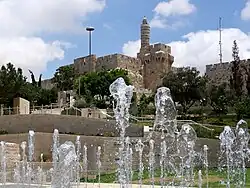 A major feature of the park is its splash fountain that orchestrates animated water, sound and lighting. Journalist Linda Gradstein described it as a landscape of "spouting water geysers" just outside the walls of the Old City.[3] Water shoots from the fountains in sync with music every 30 minutes; in the evening a light show plays while during the day children run among the water spouts.[4] The music was composed by the New Jerusalem Orchestra and the East West Ensemble (Yisrael Borochov) incorporating themes from Jewish, Arab and African musical traditions.[1][5] The fountain was donated by Alan Hassenfeld, philanthropist and former Hasbro Toys chairman.[1] The fountain is noted as a place where people from every segment of Jerusalem's ethnically and religiously varied population mingle with visitors from around the globe.[6] The water feature concept was developed by Stéphane Llorca of JML Consultants.[1]