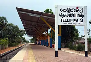 Tellippalai railway station (Tamil: தெல்லிப்பழை தொடருந்து நிலையம் Tellippaḻai toṭaruntu nilaiyam) is a railway station in the town of Tellippalai in northern Sri Lanka. Owned by Sri Lanka Railways, the state-owned railway operator, the station is part of the Northern Line which links the north with the capital Colombo. The station was not functioning between 1990 and 2015 due to the civil war. The Northern Line between Jaffna and Kankesanthurai was re-opened on 2 January 2015.[1][2]