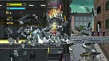 Tembo the Badass Elephant is a 2D platform side-scrolling game in which players take control of an elephant named Tembo, as he progresses through Shell City to stop the invasion of a military force called the Phantom.[3] The title features visuals similar to that of cartoons and comic books, and divided into three different zones with three basic levels and an enemy base, followed by a boss stage each. Each enemy base can only be unlocked by killing a set quota of enemies on previous levels. Once all three zones are completed, a fourth, last zone consisting of two levels and the final boss stage is unlocked. The major goal of every level is to reach the end of the level while destroying as much of the enemy force as possible, while innocent citizens held prisoners are scattered around the stage, waiting to be rescued as well, and a medal is awarded for rescuing all hostages in a stage.[4][5]
