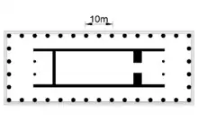 The building was constructed on a crepidoma of three steps, which was erected on top of a substructure on the northern and western sides (due to the roughness of the terrain). It is a peripteros temple of unusually elongated proportions (67 metres long and 25.34 meters wide), with six columns along the front (hexastyle) and fifteen columns on the sides. Inside the peristasis is a long naos, bounded by a pronaos at the front and an opisthodomos at the back, both in antis. Their remains seem to indicate that the building was destroyed by an earthquake.