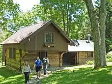 Over the years Lunt and Fontanne continued building and developing at Ten Chimneys. In 1936 they added the L-shaped swimming pool[11] and the cabana.[12] In 1938 they began remodeling and expanding the house, adding quarters for the cook and housekeeper and extra living space. The design was a collaboration between Lunt and architect Charles Dornbusch of Loebl, Schlossman and Demuth of Chicago, who helped with most of the structures on the estate, including the cottage fourteen years before. In 1939 they added the metal gate around the auto court. In 1947 they completed the new chicken coop (designed with advice from a specialist at the UW Ag Department) and greenhouse,[13] and the gatehouse.[14] Also in 1947 they reconstructed the Studio, a traditional hewn-log building that was taken apart in Sweden, shipped to America, and reassembled for use as a rehearsal space.[15] Flagstone paths and retaining walls were added later to tie the estate together.[5]