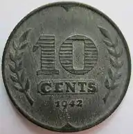 The zinc 10-cent coin was minted in the Netherlands between 1941 and 1943 during World War II. It was worth 1/10, or .10, of the guilder, and designed by Nico de Haas, a Dutch national-socialist. The respective mintage was of 29,800,000 (1941), 95,600,000 (1942), 29,000,000 (1943).[1]