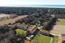 When contracted by Maria Luisa in the late 1810s, Nottolini designed a large landscaping project which covered the pine forest area known as Pineta di Levante, stretching for some 4 km along the sea coast from Viareggio to the border between the duchies of Lucca and Tuscany.[54] Its axis was to be a large avenue parallel to the coastline, with perpendicular paths and specific areas designed for different types of vegetation.[55] Some sources state that the centre of the estate was to be a hunting cottage,[56] but others refer to a grandiose residential design, a palace intended to impress.[57] Carlo Ludovico asked Nottolini to scale down the project. Eventually the residence was to consist of 3 separate buildings; the central one was intended as residenza signorile, to be flanked by 2 other buildings supposed to accommodate servants and as stables, magazines, workshops, a forge, a carriage house and similar. In the 1840s the central edifice was enlarged with side wings, which connected all 3 buildings.