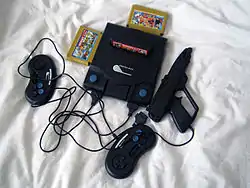 The typical retail set included the system, two detachable controllers (both with "turbo" buttons, which meant 4 buttons in total), a light gun, which also based on the original Nintendo gun accessory except the design, power supply and RF cable. The console had a built-in RF modulator, as well as mono audio and composite video through RCA connectors.[11] The system itself could include built-in games, but most common versions were bundled with cartridges such as "1000000 in 1" or "9999999 in 1", supposedly featuring a million games, only a small number of which actually being separate games and the rest just renamed versions of the latter.[12] Usually these were popular games such as Super Mario Bros. or Duck Hunt. Occasionally they were renamed, possibly in an attempt to avoid lawsuits.