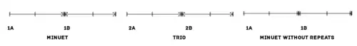 In a trio form each section is a dance movement in binary form (two sub-sections which are each repeated) and a contrasting trio movement also in binary form with repeats. An example is the minuet and trio from Haydn's Surprise Symphony. The minuet consists of one section (1A) which is repeated and a second section (1B) which is also repeated. The trio section follows the same format (2A repeated and 2B repeated). The complete minuet is then played again at the end of the trio represented as: [(1A–1A–1B–1B) (2A–2A–2B–2B) (1A–1A–1B–1B)]. By convention in the second rendition of the minuet, the sections are not repeated with the scheme [(1A–1A–1B–1B) (2A–2A–2B–2B) (1A–1B)]. The trio may also be referred to as a double or as I/II, such as in Bach's polonaise and double (or Polonaise I/II) from his second orchestral suite and his Bourrée and double (or Bourrée I/II) from his second English Suite for harpsichord.