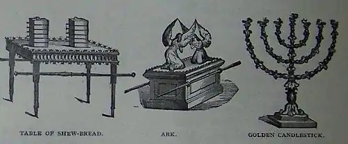 In the second reading, God told them to make two cherubim of gold to be for the ark's cover over the mercy seat.[6] God promised to impart commandments to Moses from between the two cherubim above the cover of the Ark.[7] God instructed them to make a table of acacia wood overlaid with gold, on which to set the bread of display or showbread.[8]