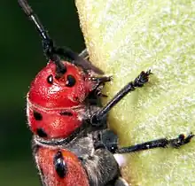 These beetles feed by opening veins in the milkweed plant, decreasing the beetles' exposure to latex-like sap.[6] When startled, the beetles make a shrill noise, while they make a 'purring' noise when interacting with another beetle.[6] The red and black coloring are aposematic, advertising the beetles' inedibility. Red milkweed beetles lay egg-clutches in mid-summer inside the stem base of the milkweed plant.[7]