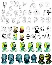 According to art director Derek Watts, Thane was the hardest character to design for Mass Effect 2.[17] BioWare started with a written description of Thane, and wanted to emphasise him as a "career assassin" while keeping him attractive as a possible romantic interest for female players.[17] They asked the women in the office what they "liked" in their aliens.[17] Concept artists began by drawing on lizards and birds-of-paradise for inspiration.[18] It was considered giving Thane's face a "mannequin-like, 'perfect human' appearance",[18][17] and a red mark was considered as a possible key feature for the character.[17] Feedback was received from the women in the office who found the character "creepy",[17] and as the character was a romantic interest the mannequin-face was decided to be too "off-putting".[18] The team went "back to the drawing board",[17] with Thane later becoming a mix of "aquatic" and "reptilian" characteristics.[18] Thane ultimately went through eight or nine "phases" before his design was finalised.[19] The character was originally intended to have three metal earrings on the sides of his head, but the developers forgot to include this in his model.[17]