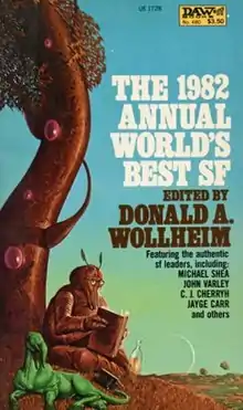 The 1982 Annual World's Best SF is an anthology of science fiction short stories edited by Donald A. Wollheim and Arthur W. Saha, the eleventh volume in a series of nineteen. It was first published in paperback by DAW Books in May 1982, followed by a hardcover edition issued in September of the same year by the same publisher as a selection of the Science Fiction Book Club. For the hardcover edition the original cover art of Wayne D. Barlowe was replaced by a new cover painting by Dawn Wilson.