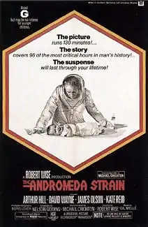 The Andromeda Strain is a 1971 American science fiction thriller film produced and directed by Robert Wise. Based on Michael Crichton's 1969 novel of the same name and adapted by Nelson Gidding, the film stars Arthur Hill, James Olson, Kate Reid, and David Wayne as a team of scientists who investigate a deadly organism of extraterrestrial origin. With a few exceptions, the film follows the book closely. The special effects were designed by Douglas Trumbull. The film is notable for its use of split screen in certain scenes.