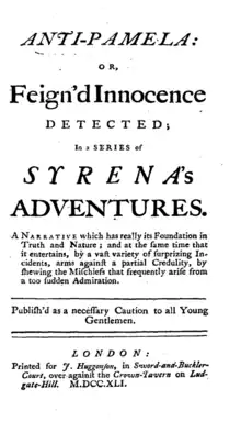 The Anti-Pamela; or Feign'd Innocence Detected is a 1741 novel written by Eliza Haywood as a satire of the 1740 novel Pamela; or, Virtue Rewarded by Samuel Richardson. It has also been presented with the subtitle "Mock-Modesty Display'd and Punish'd."[1]