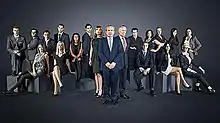 ![]() Promo group shot of Alan Sugar, Nick Hewer, and Karren Brady standing before the candidates for series 6 | |