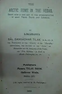 The Arctic Home in the Vedas is a 1903 pseudohistorical book on the origin of the Indo-Aryan peoples by Indian nationalist, teacher and independence activist Bal Gangadhar Tilak.[1] Based on his analysis of Vedic hymns, Avestic passages, Vedic chronology and Vedic calendars, Tilak argued that the North Pole was the original home of Aryans during the pre-glacial period, which they left due to climate changes around 8000 B.C., migrating to the Northern parts of Europe and Asia.