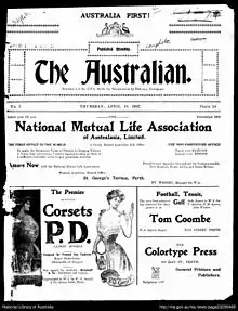The Australian was first published on 18 April 1907 by The Colortype Press, printers and publishers in Hay Street, for the proprietors A.H. O'Connor and H. Hornby of the Western Australian branch of the Australian Natives' Association.[2] The newspaper served to support the ANA's nationalistic aims including the advancement of the Commonwealth, protectionism,[3][4] compulsory military training, the development of a strong home naval program, and the maintenance of the White Australia policy.[5][6]