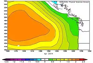 - 1 2 3 4 5 Bond, Nicholas A.; Cronin, Meghan F.; Freeland, Howard; Mantua, Nathan (16 May 2015). "Causes and impacts of the 2014 warm anomaly in the NE Pacific". Geophysical Research Letters. 42 (9): 3414–3420. Bibcode:2015GeoRL..42.3414B. doi:10.1002/2015GL063306.