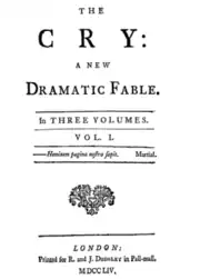 Jane Collier's and Sarah Fielding's The Cry: A New Dramatic Fable (1754) was Fielding's sixth and Collier's second and final work. The work is an allegorical and satirical dramatic dialogue which was never performed.[1] Collier and Fielding had worked together previously when Fielding wrote The Governess and when Collier wrote An Essay on the Art of Ingeniously Tormenting, but The Cry is the only work that can be positively ascribed to the two together.[2] Collier died the year after its publication.