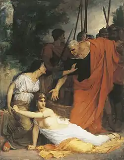 The death of Claudius's wife Messalina in the Gardens of Lucullus (as reported by Tacitus) was the subject set for candidates for the Prix de Rome in 1870. The historian relates that her killing was a hurried affair, ordered by the Emperor's freedman Narcissus when Claudius showed himself inclined to mercy. "Evodus, [another] of the freedmen, was appointed to watch and complete the affair. Hurrying on before with all speed to the gardens, he found Messalina stretched upon the ground, while by her side sat Lepida, her mother, who, though estranged from her daughter in prosperity, was now melted to pity by her inevitable doom, and urged her not to wait for the executioner."[2]