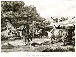 At the start of the 19th century a recension of the fables in Greek and Latin provided another moral that highlights the weakness of the frog's self-promotion: Iactantia refutat seipsam (boasting disproves itself).[8] Croxall had also underlined the questionable nature of the frog's discourse that, being "uttered in a parcel of hard, cramp words which nobody understood, made the beasts admire his learning and give credit to everything he said." All, that is, except the fox, who saw through the frog's pretence. Illustrations of the fable have consequently depicted the gullible audience surrounding the frog as it takes its stance on the edge of the marsh, generally with the fox sitting off to one side. In Heinrich Steinhöwel's edition (1478) the listeners include nothing more exotic than a rat, a rabbit and a hedgehog,[9] but Henry Walker Herrick (1869)[10] and Ernest Griset (1874)[11] furnish a more varied menagerie. Francis Barlow concentrates largely on an audience of domestic animals but places a squirrel and a monkey in the overhanging branches of a tree,[12] where Samuel Croxall's illustrator[13] and Thomas Bewick (1818)[14] confine themselves to deer and farm beasts. The frog addresses these from the bank or, in the case of Samuel Howitt (1810, see above), from a marshy tussock. Later artists portray the frog as a huckster performing in front of a cluster of bystanders, as in the case of J. M. Condé (1905),[15] Arthur Rackham (1912),[16] John Vernon Lord (1989)[17] and Arlene Graston (2016).[18] These change the focus to the title given the story by George Fyler Townsend (1887), "The Quack Frog".[19]