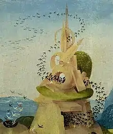 To their right a knight with a dolphin tail sails on a winged fish. The knight's tail curls back to touch the back of his head, which references the common symbol of eternity: the snake biting its own tail. On the immediate right of the panel, a winged youth soars upwards carrying a fish in his hands and a falcon on his back.[40] According to Belting, in these passages Bosch's "imagination triumphs ... the ambivalence of [his] visual syntax exceeds even the enigma of content, opening up that new dimension of freedom by which painting becomes art."[15] Fraenger titled his chapter on the high background "The Ascent to Heaven", and wrote that the airborne figures were likely intended as a link between "what is above" and "what is below", just as the left and right hand panels represent "what was" and "what will be".[41]