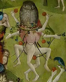 The focal point of the scene is the "Tree-Man", whose cavernous torso is supported by what could be contorted arms or rotting tree trunks. His head supports a disk populated by demons and victims parading around a huge set of bagpipes—often used as a dual sexual symbol[42]—reminiscent of human scrotum and penis. The tree-man's torso is formed from a broken eggshell, and the supporting trunk has thorn-like branches which pierce the fragile body. A grey figure in a hood bearing an arrow jammed between his buttocks climbs a ladder into the tree-man's central cavity, where nude men sit in a tavern-like setting. The tree-man gazes outwards beyond the viewer, his conspiratorial expression a mix of wistfulness and resignation.[47] Belting wondered if the tree-man's face is a self-portrait, citing the figure's "expression of irony and the slightly sideways gaze [which would] then constitute the signature of an artist who claimed a bizarre pictorial world for his own personal imagination".[42]