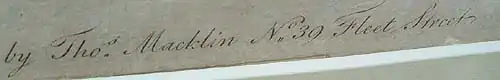 On the bottom center of the engraving (continued from the above) is the place of publication: The Thomas Macklin print shop at No. 39 Fleet Street, London.
