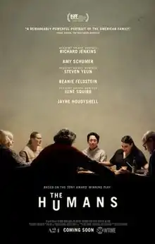 The Humans is a 2021 American psychological drama film[2] written and directed by Stephen Karam in his feature directorial debut, and based on his one-act play of the same name. It stars Richard Jenkins, Jayne Houdyshell, Amy Schumer, Beanie Feldstein, Steven Yeun, and June Squibb. It had its world premiere at the 2021 Toronto International Film Festival on September 12, 2021. The film was released by A24 on November 24, 2021, both in theaters and on Showtime.