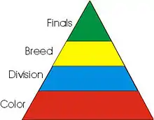 The cat show competition is structured like a pyramid. First, all of the entries are divided into their respective classes.[10] Within each of these classes, cats are called to the judging ring according to breed, division and color/pattern.[11]