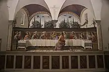 This Last Supper fresco in Ognissanti, Florence was made in 1480 and measures 13 feet by 26 feet and 6 inches (or 4 meters by 8.1 meters).[7] Domenico's stylistic approach draws attention to the recession of space and illusionistic the depth at the back of the room and around the windows, along with the presence of corbels, and the placement of figures.[2] The work is known for the various expressive facial reactions and bodily actions, like hand gestures of the different figures at the table.[2] The Ognissanti piece also is placed at the end architectural bay of the refectory rather than the middle.[2] The main table is U-shaped and is located on the entire east-side wall of the actually refectory. The whole piece looks like a still-life filled with arches and arch-shaped windows.[2] The open upper-story window view includes sights of pheasants, falcons, cypress, and citrus trees.[7]