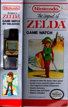 The Legend of Zelda[12] game watch is a multi-purpose wristwatch made by Nelsonic (re-released for European markets by Zeon in 1992) as part of their Game Watch line.[13] It tells the time and allows players to play a game. It runs on one battery, size #364 (black watch) or #392 (red watch). The game is based on the NES's original The Legend of Zelda, and it was manufactured in black, red, white and pink colors.
